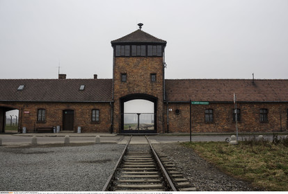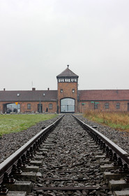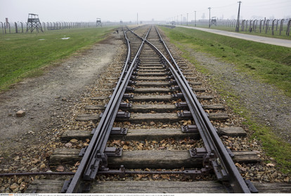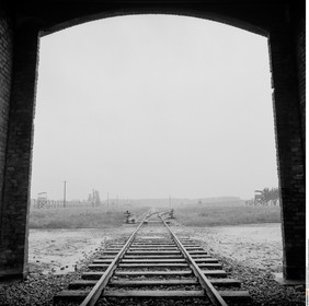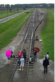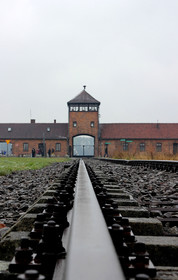 Europe, Pologne, Voivodie de petite pologne, Oswiecim, Auschwitz Birkenau, les rails de l entree ou les prisonniers arrivent, construit a partir de 1940 par heinrich himmler avec la porte d entree du camp de la mort, plus de 1.1 millions d enfants, de femmes et d hommes meurent dont 900 000 directement a la sortie du train, aujourd hui monument historique et culturel qui contribue au devoir de memoire inscrit au patrimoine mondial de l unesco.