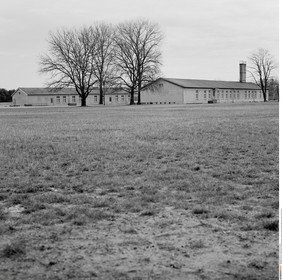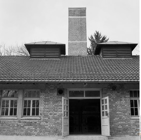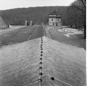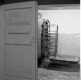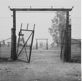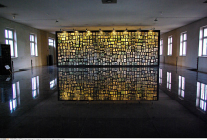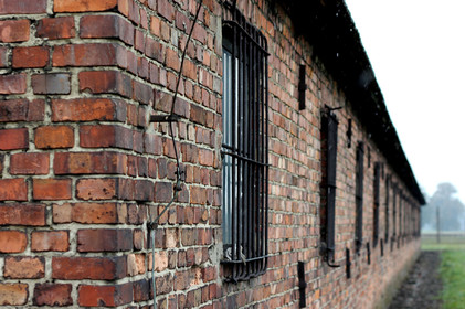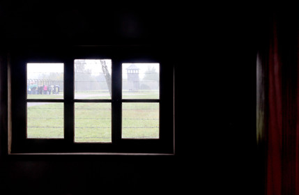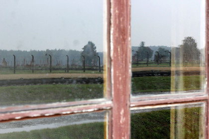Europe, Pologne, Voivodie petite pologne, Oswiecim, Auschwitz Birkenau, a travers la fenetre du baraquement ou le trie se faisait a l arrivee des prisonniers, l on peut observer dans le reflet les vestiges du camp, construit a partir de 1940 par heinrich himmler, plus de 1.1 millions d enfants, de femmes et d hommes meurent dont 900 000 directement a la sortie du train, aujourd hui monument historique et culturel qui contribu au devoir de memoire inscrit au patrimoine mondial de l unesco