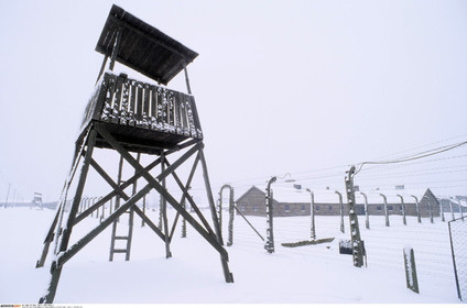 Europe, Pologne, Voivodie petite pologne, Oswiecim, Auschwitz Birkenau, les vestiges de l un des batiments sur l aile droite du camp, ici les vestiges des barraquements des habitations des femmes avec l un des nombreux mirador, construit a partir de 1940 par heinrich himmler, plus de 1.1 millions d enfants, de femmes et d hommes meurent dont 900 000 directement a la sortie du train, aujourd hui monument historique et culturel qui contribu au devoir de memoire inscrit au patrimoine mondial de l unesco