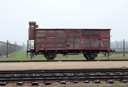 Europe, Pologne, Voivodie petite pologne, Oswiecim, Auschwitz Birkenau, un wagon a bestiaux avec lequel les prisonniers etaient achemines en exposition au milieu du camp, construit a partir de 1940 par heinrich himmler avec la porte d entree du camp de la mort, plus de 1.1 millions d enfants, de femmes et d hommes meurent dont 900 000 directement a la sortie du train, aujourd hui monument historique et culturel qui contribu au devoir de memoire inscrit au patrimoine mondial de l unesco