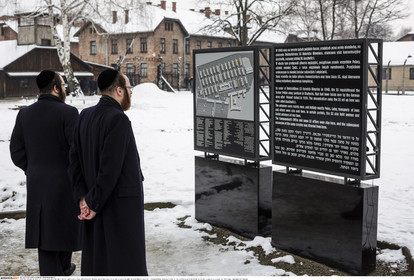 Europe, Pologne, Voivodie de petite pologne, Oswiecim, Auschwitz Birkenau, plaque commemorative au fond du camp, ce texte est inscrit sur 22 dalles fixÈes sur le sol d un monument, toutes traduites dans des langues differentes, construit a partir de 1940 par heinrich himmler , plus de 1.1 millions d enfants, de femmes et d hommes meurent dont 900 000 directement a la sortie du train, aujourd hui monument historique et culturel qui contribu au devoir de memoire inscrit au patrimoine mondial de l unesco.