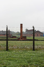Europe, Pologne, Voivodie petite pologne, Oswiecim, Auschwitz Birkenau, les vestiges de l un des batiments sur l aile droite du camp, ici les vestiges des barraquements des habitations des femmes avec au premier plan les barbeles electrifies, le camp est construit a partir de 1940 par heinrich himmler, plus de 1.1 millions d enfants, de femmes et d hommes meurent dont 900 000 directement a la sortie du train, aujourd hui monument historique et culturel qui contribu au devoir de memoire inscrit au patrimoine mondial de l unesco