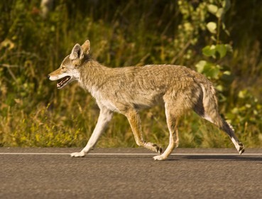 • Wyoming: Coyote crossing the road with traffic in Yellowstone National Park. ©David R. Frazier / The Image Works