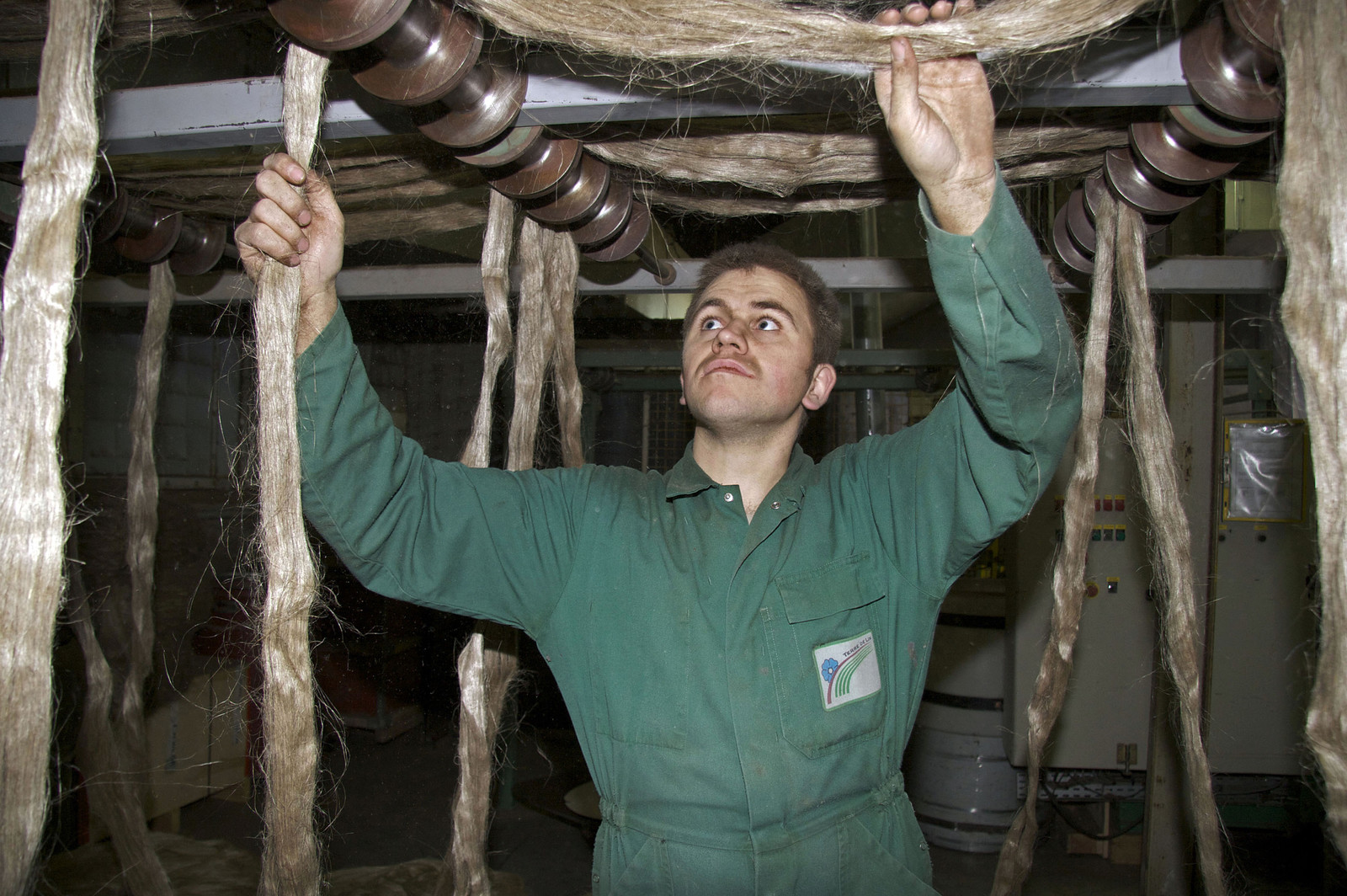 | Description | Alain Cordier, disentangles slivers of hackled flax coming out of the end of the hackling line, Terre de Lin, Saint Pierre le Viger, Seine Maritime, France |