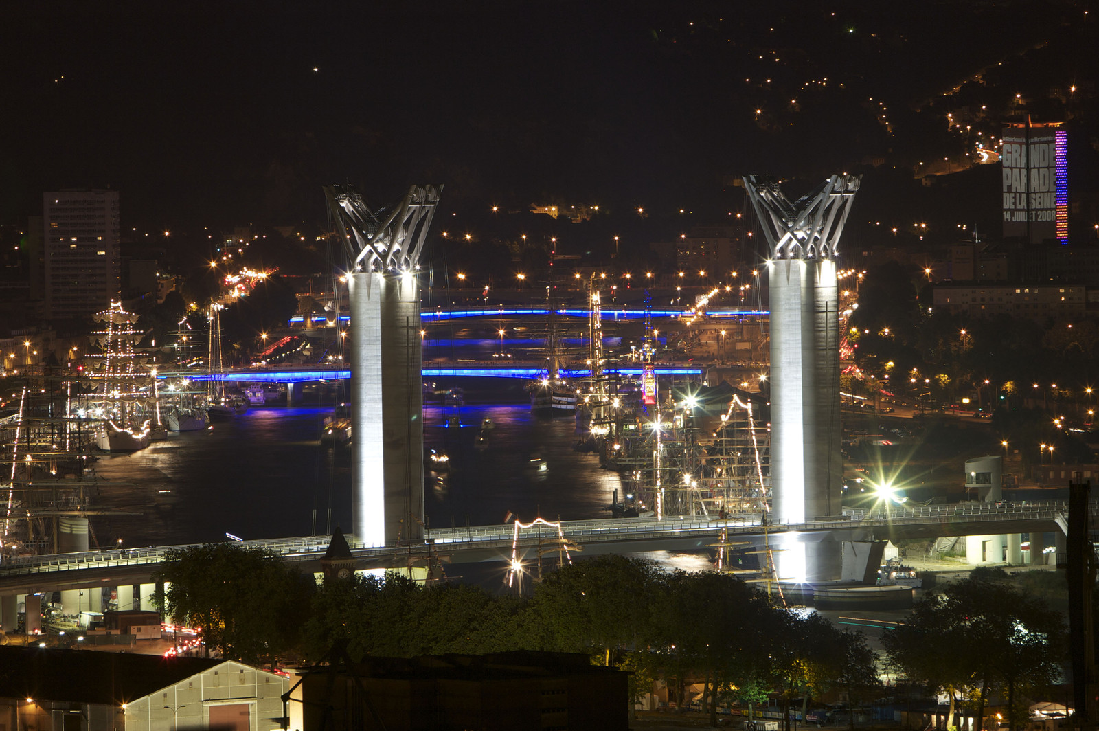 | Description | The Gustave Flaubert bridge at night seen from Canteleu near Rouen, Upper Normandy, France.This is a lift bridge with a span of 120 m and a total height of 86 m. In the upper position, it is 55 m above the Seine in the upper position making it the highest lift bridge in the world. It opened officially on 25 September 2008 after 4 years of work. |