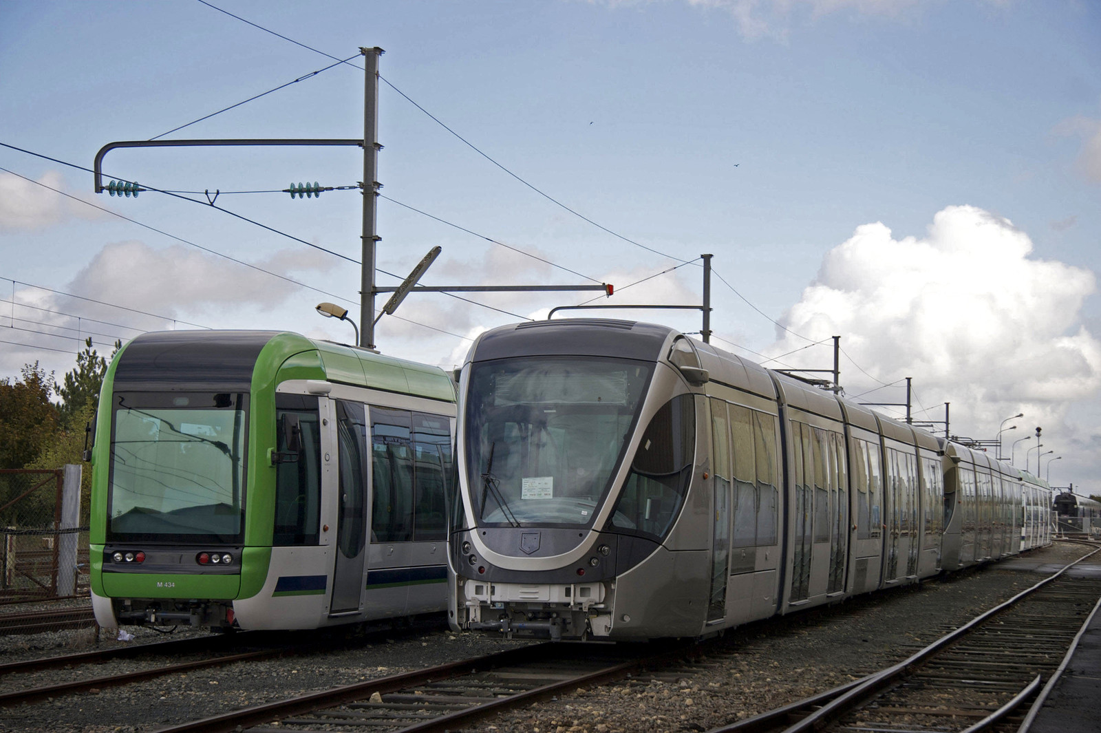 | Description | Trams await delivery outside the Alstom factory, La Rochelle, Charente Maritime, France |