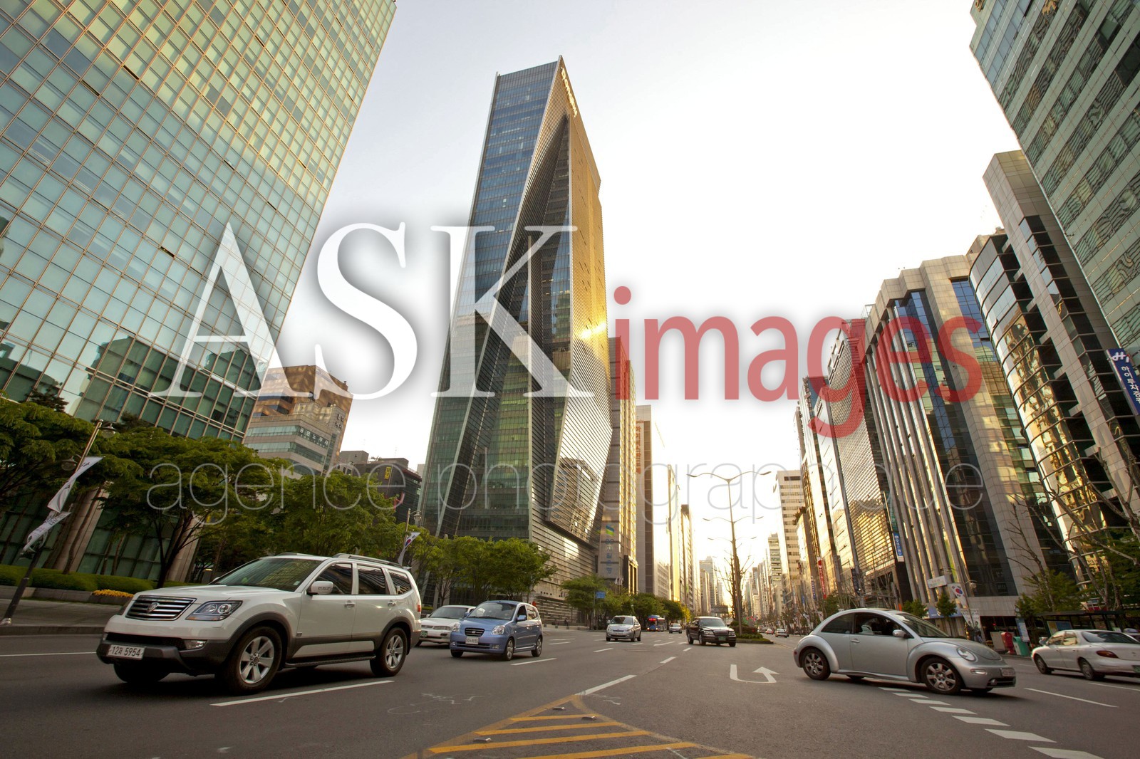 DescriptionSEOUL : COREE DU SUD *** Local Caption *** Deux haies de gratte-ciel ,dont le DONGBU FINANCE BUILDING à gauche ,sur Teheran Avenue