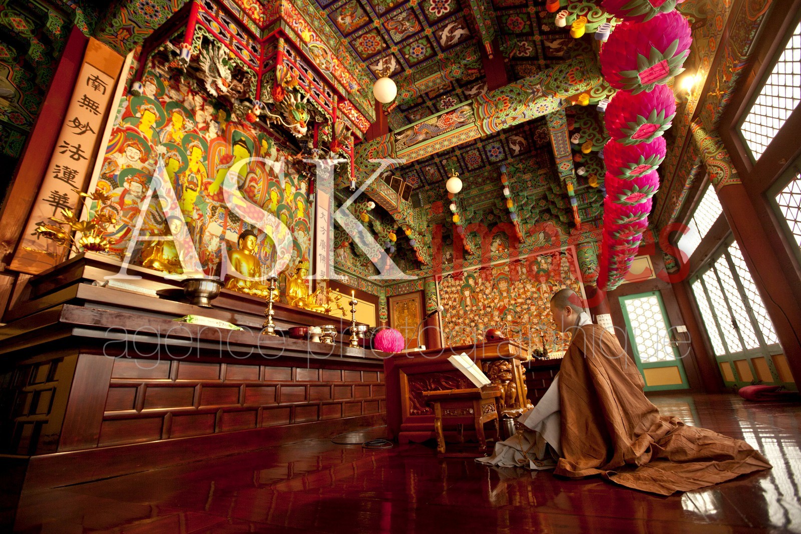 | Description | Seoul, nun praying in front of the frescoes of the Awakened in the Buddhist monastery, district of Mapa nonne priant devant les fresques de l'Eveill |