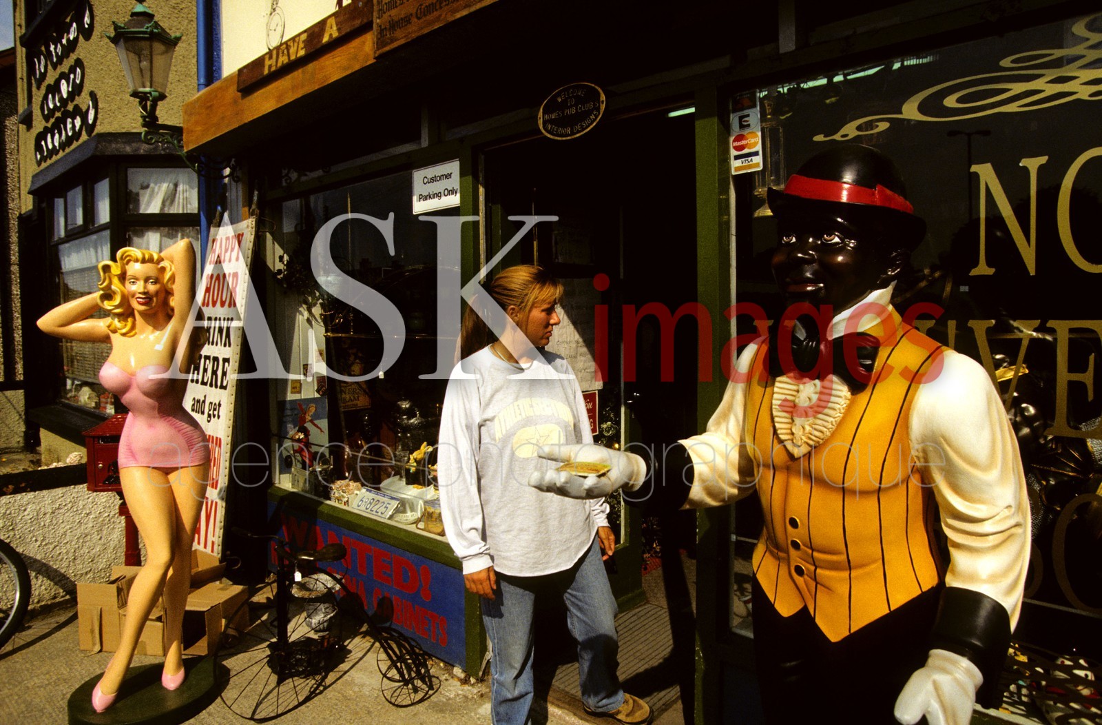 DescriptionNorthern Ireland, Portrush. Tourist in front of antic shop