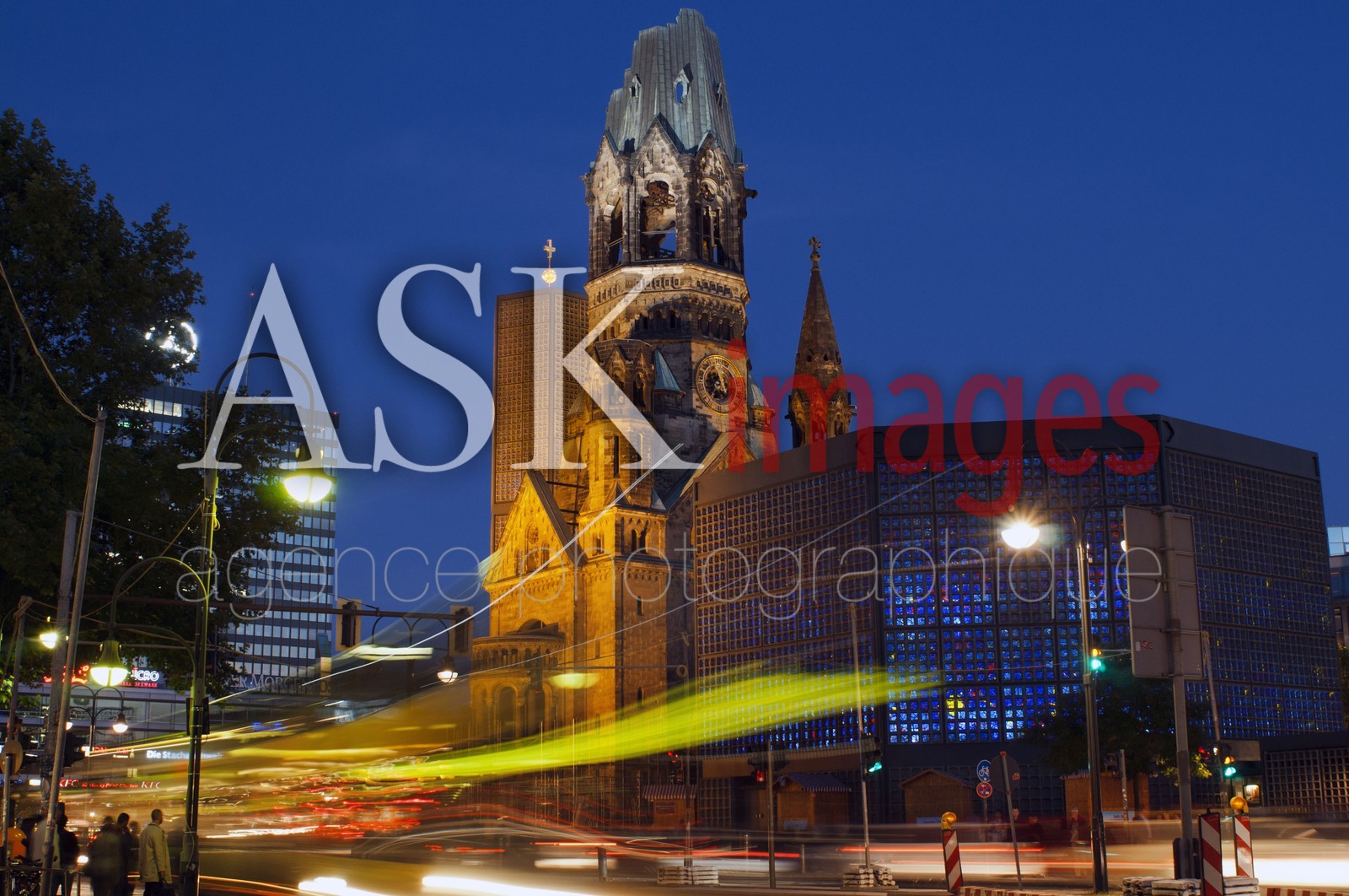 DescriptionGermany, Berlin, Kaiser Wilhelm memorial Church at twilight. The Protestant Kaiser Wilhelm Memorial Church is located in Berlin on the Kurfurstendamm in the centre of the Breitscheidplatz..
