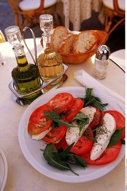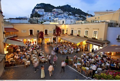 ITALY / Italian Coffeehouses / Campania / Capri / La Piazzetta ( Piazza Umberto I ) / cafes and bars : Al Piccolo Bar ( left ) , Gran Caffe ( middle ) and Bar Tiberio ( right )..© Christina Anzenberger-Fink / Anzenberger Italie du sud, Campanie