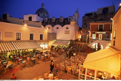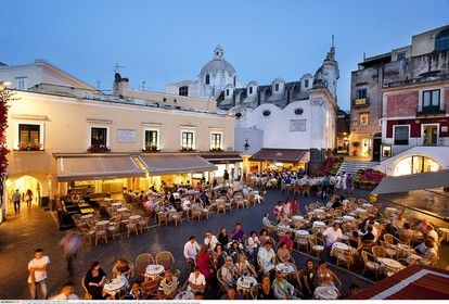 ITALY / Italian Coffeehouses / Campania / Capri / view from Al Piccolo bar to La Piazzetta ( Piazza Umberto I ) with the church Chiesa Santo Stefano and the Gran Caffe ( middle ) and the Bar Tiberio ( behind )..© Christina Anzenberger-Fink / Anzenberger. Italie du sud, Campanie