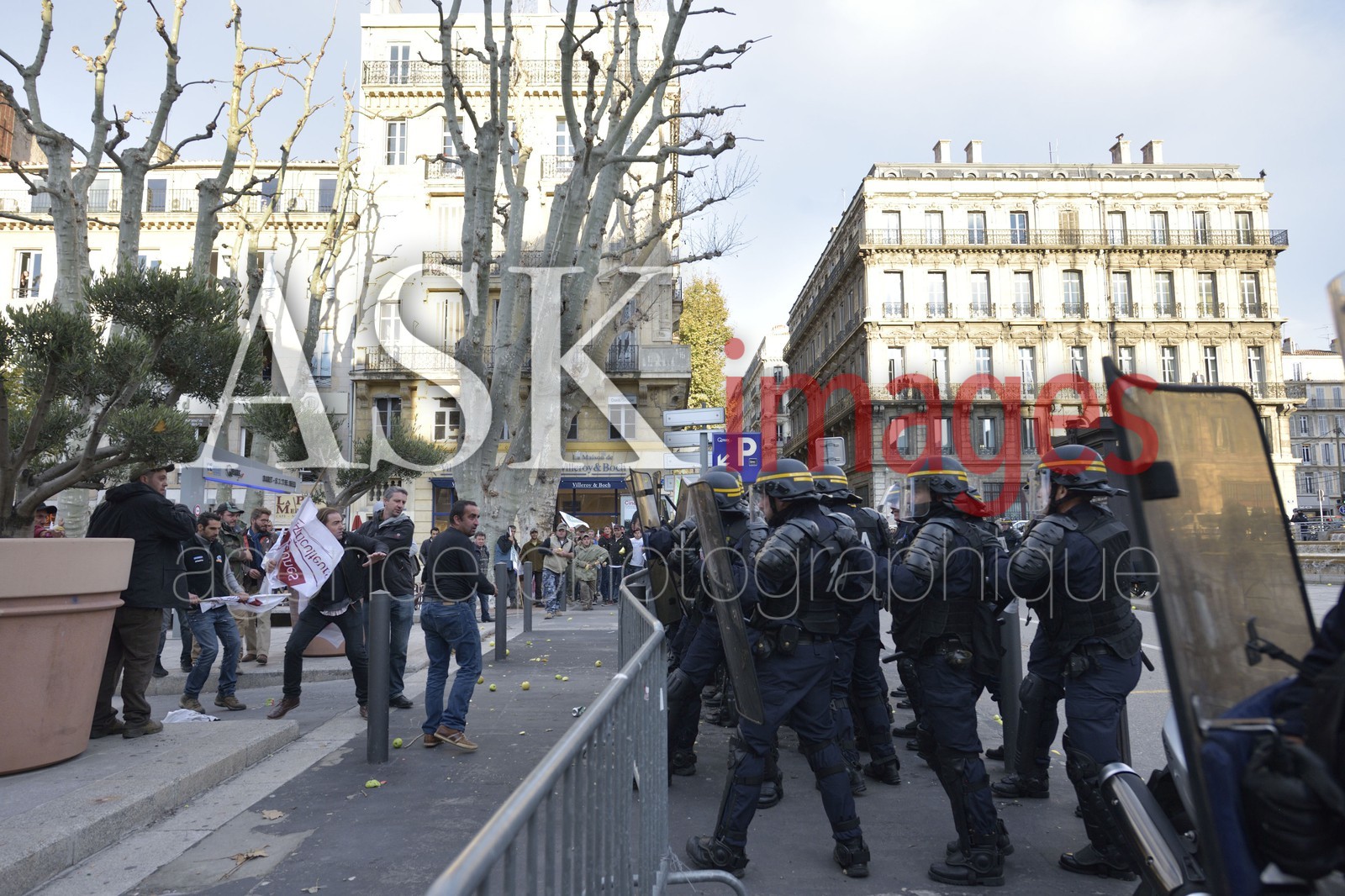 | Description | Marseille, Manifestation des Agriculteurs, Riziculteurs, Eleveurs ... à Marseille le mercredi 5 Novembre 2014 sur le vieux port et devant la préfecture. Les manifestants décident d’affronter les C R S mais ne parviendrons pas à franchir le cordon des forces de l'ordre. |