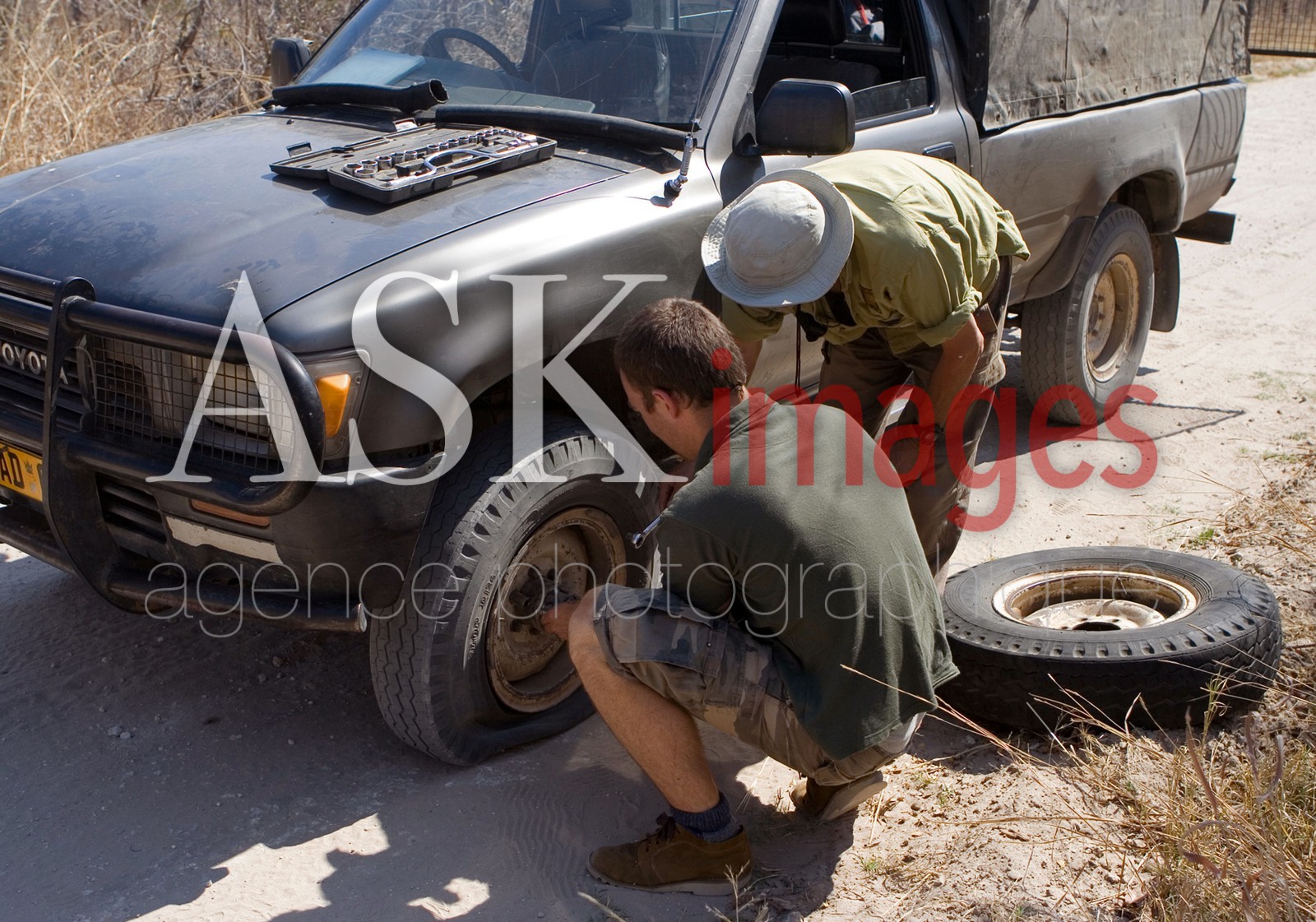 | Description | Volonteers trying to repare a flat wheel in the bush of the Hwange Park *** Des volontaires essayant de reparer une roue crevee au milieu du park Hwange |