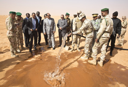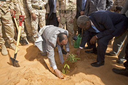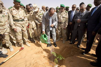 • The president of Mauritania, Mohamed Ould Abdel Aziz visits the military base of Le Meye in mauritanian desert, the president is planting a flamboyant