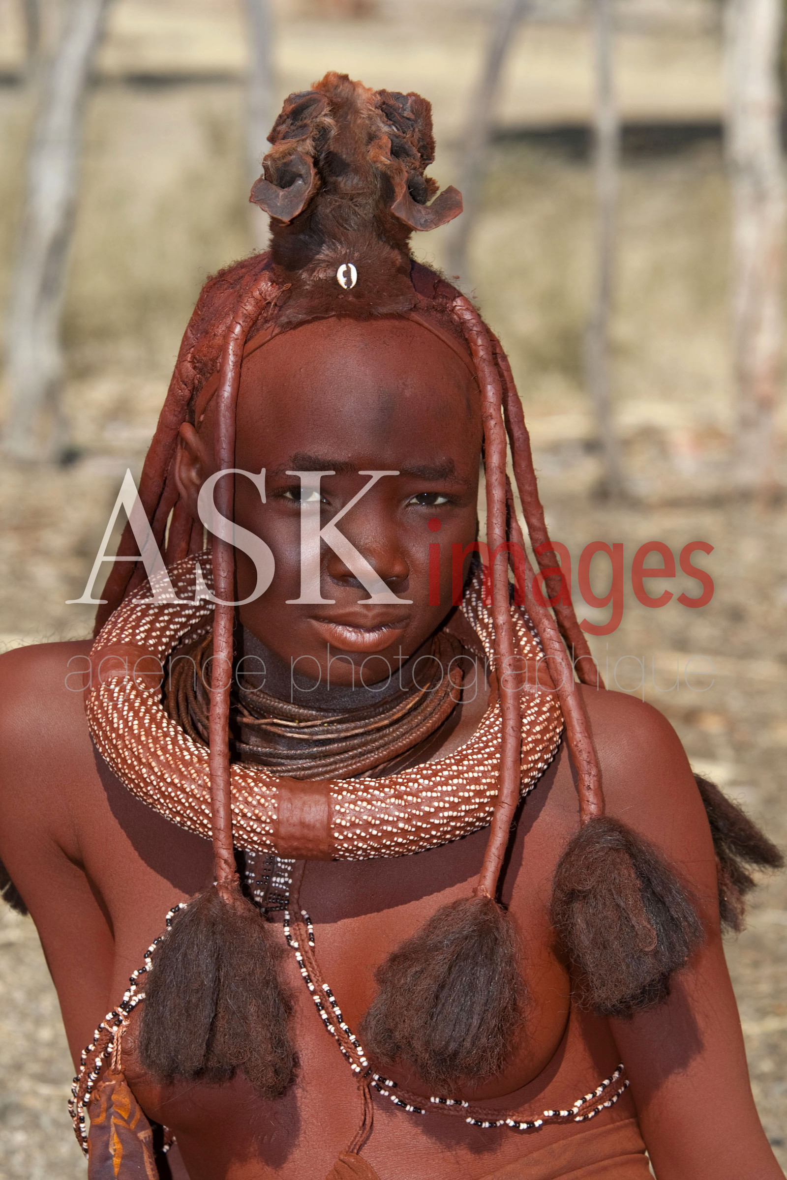 DescriptionLES HIMBA sont un peuple de pasteurs nomades de Namibie. Ils se parent volontiers de colliers en cuir et d'anneaux en laiton et enduisent leur peau d'une pate a base de beurre et de bois rouge . Les jeunes filles portent deux nattes epaisses, tressees vers l'avant du visage et redressees au dessus du front telles des cornes *** THE HIMBA are a nomadic people of Namibia. They adorn themselves with leather collars and brass rings and coat their skin with a paste made of butter and red wood. Girls wear two thick plaits, braided forward face and straightened above the forehead like horns, Namibia.