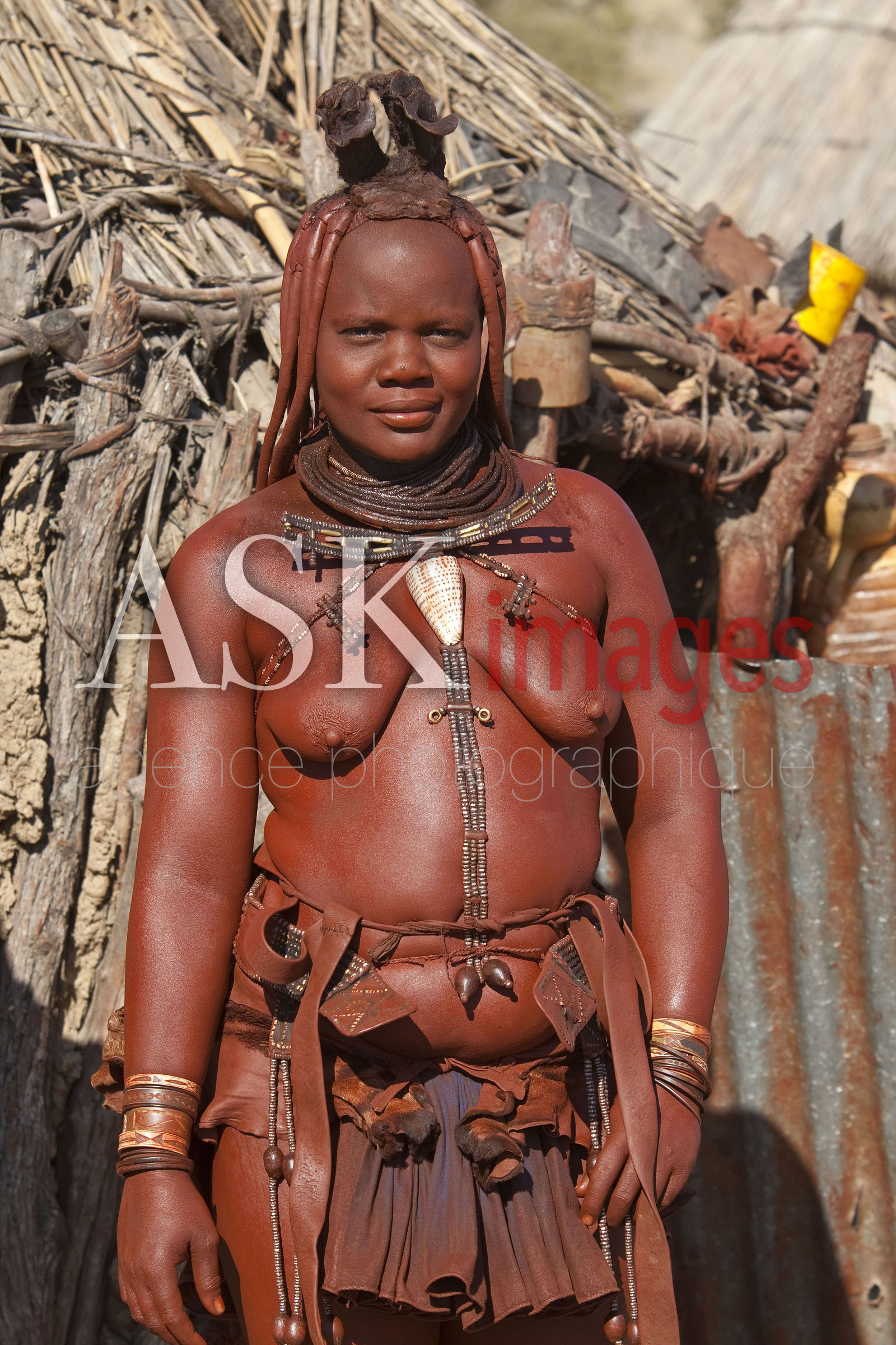 DescriptionLES HIMBA sont un peuple de pasteurs nomades de Namibie. Ils se parent volontiers de colliers en cuir et d'anneaux en laiton et enduisent leur peau d'une pate a base de beurre et de bois rouge . Les jeunes filles portent deux nattes epaisses, tressees vers l'avant du visage et redressees au dessus du front telles des cornes *** THE HIMBA are a nomadic people of Namibia. They adorn themselves with leather collars and brass rings and coat their skin with a paste made of butter and red wood. Girls wear two thick plaits, braided forward face and straightened above the forehead like horns, Namibia.