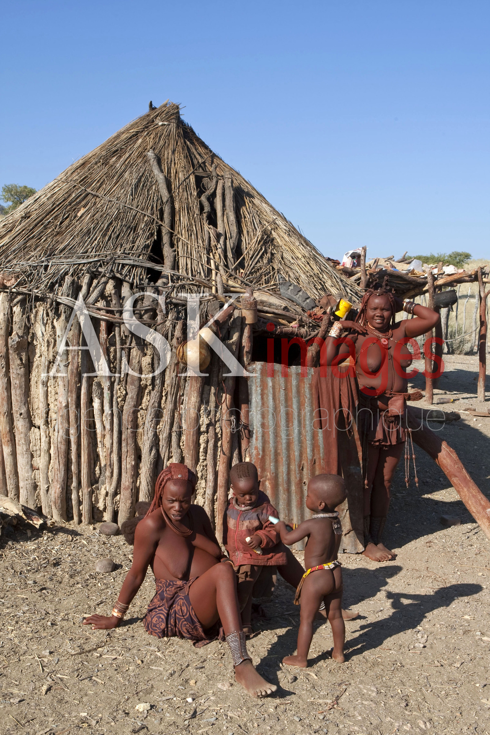 DescriptionLES HIMBA sont un peuple de pasteurs nomades de Namibie. Ils se parent volontiers de colliers en cuir et d'anneaux en laiton et enduisent leur peau d'une pate a base de beurre et de bois rouge. les cases appellees ''pontok'' sont faites de branches et branchages recouverts d'un melange d'argile et de bouse sechee *** THE HIMBA are a nomadic people of Namibia. They adorn themselves with leather collars and brass rings and coat their skin with a paste made of butter and red wood, Namibia. The huts are called "pontok" and are made with tree branches covered with mixted with clay and dung