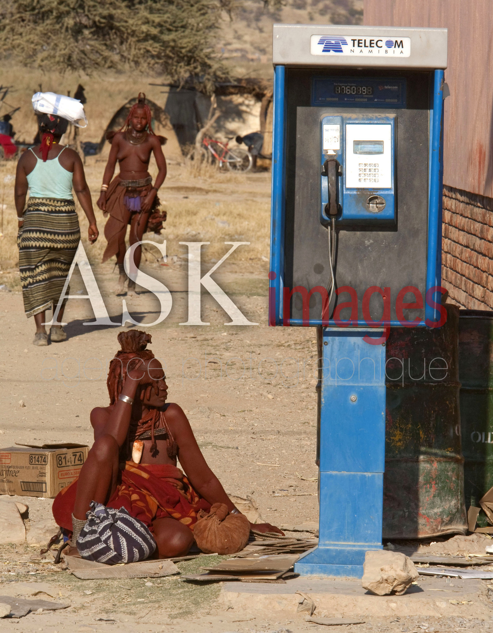 DescriptionLES HIMBA sont un peuple de pasteurs nomades de Namibie. Ils se parent volontiers de colliers en cuir et d'anneaux en laiton et enduisent leur peau d'une pate a base de beurre et de bois rouge. Un telephone public. *** THE HIMBA are a nomadic people of Namibia. They adorn themselves with leather collars and brass rings and coat their skin with a paste made of butter and red wood, a phone box in the village, Namibia.