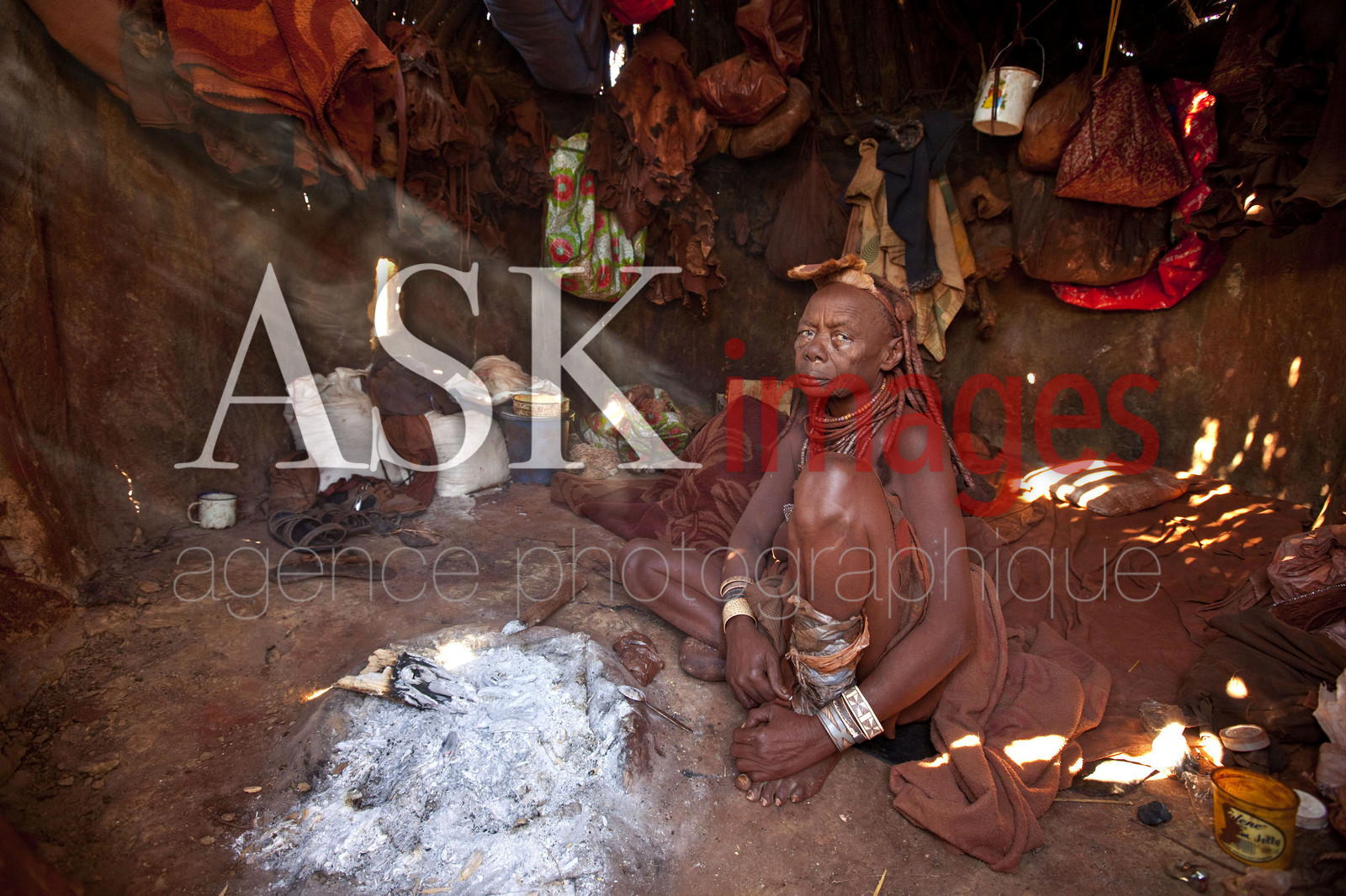 DescriptionLES HIMBA sont un peuple de pasteurs nomades de Namibie. Ils se parent volontiers de colliers en cuir et d'anneaux en laiton et enduisent leur peau d'une pate a base de beurre et de bois rouge. les cases appellees ''pontok'' sont faites de branches et branchages recouverts d'un melange d'argile et de bouse sechee. L'interieur d'une case *** THE HIMBA are a nomadic people of Namibia. They adorn themselves with leather collars and brass rings and coat their skin with a paste made of butter and red wood. The huts are called "pontok" and are made with tree branches covered with mixted with clay and dung. Iinterior of a hut, Namibia.