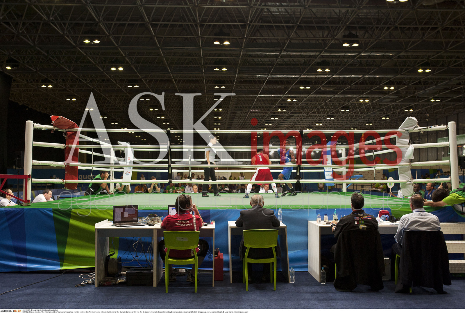 DescriptionBRAZIL / Rio de Janeiro / ..The International Box Tournament as a test event in pavilion 4 in RioCentro, one of the installations for the Olympic Games of 2016 in Rio de Janeiro..Game between Hasanboy Dusmatov (Uzbekistan) and Patrick Chagas Valerio Lourenco (Brazil)...© Lara Ciarabellini / Anzenberger