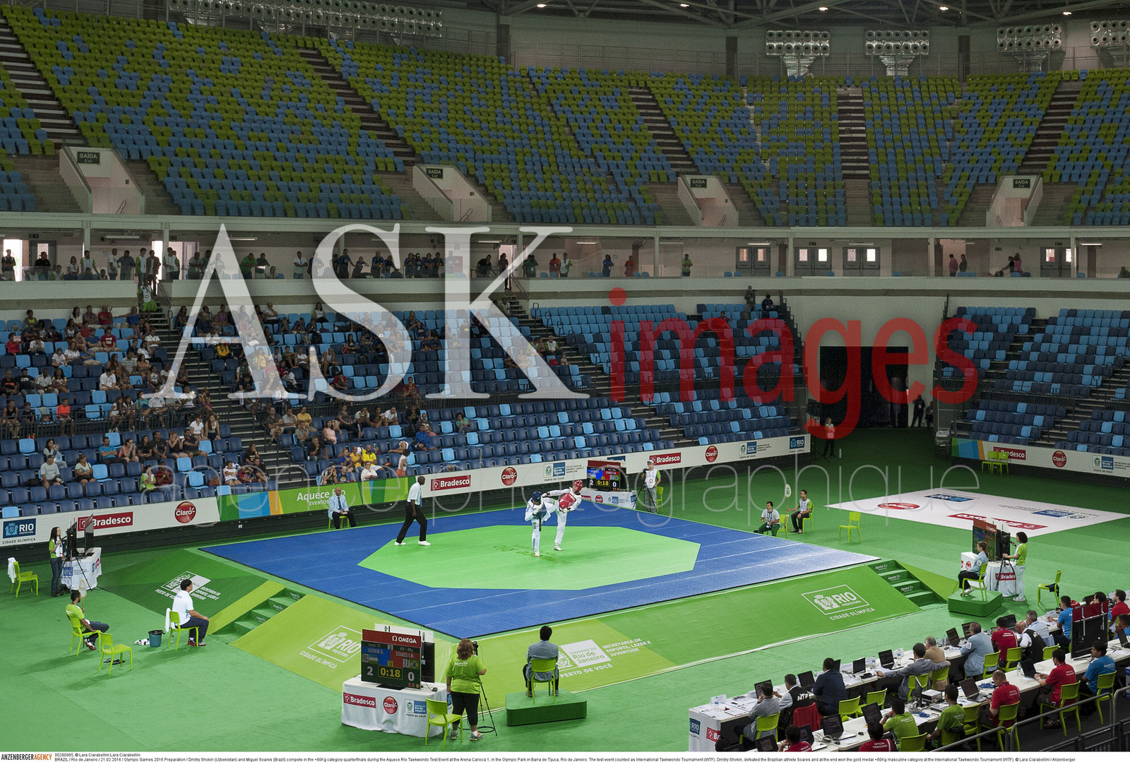 | Description | BRAZIL / Rio de Janeiro / 21.02.2016 / Olympic Games 2016 Preparation / Dmitry Shokin (Uzbekistan) and Miguel Soares (Brazil) compete in the +80Kg category quarterfinals during the Aquece Rio Taekwondo Test Event at the Arena Carioca 1, in the Olympic Park in Barra de Tijuca, Rio de Janeiro. The test event counted as International Taekwondo Tournament (WTF). Dmitry Shokin, defeated the Brazilian athlete Soares and at the end won the gold medal +80Kg masculine category at the International Taekwondo Tournament (WTF)...© Lara Ciarabellini / Anzenberger |