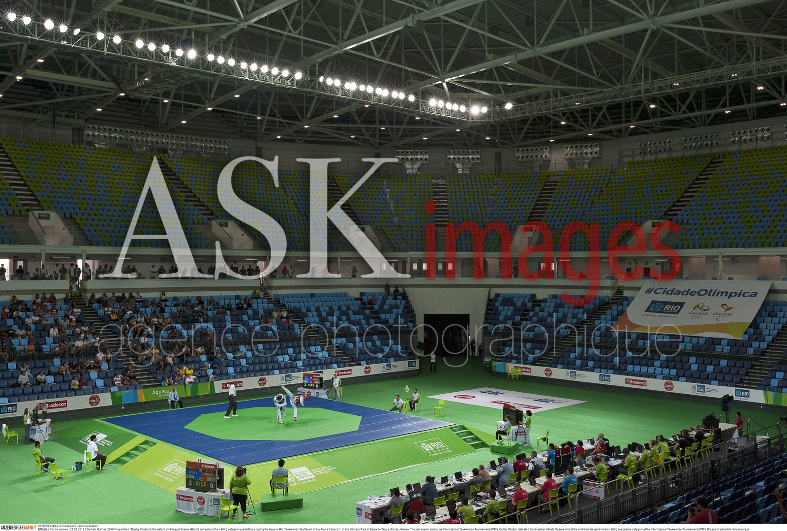 | Description | BRAZIL / Rio de Janeiro / 21.02.2016 / Olympic Games 2016 Preparation / Dmitry Shokin (Uzbekistan) and Miguel Soares (Brazil) compete in the +80Kg category quarterfinals during the Aquece Rio Taekwondo Test Event at the Arena Carioca 1, in the Olympic Park in Barra de Tijuca, Rio de Janeiro. The test event counted as International Taekwondo Tournament (WTF). Dmitry Shokin, defeated the Brazilian athlete Soares and at the end won the gold medal +80Kg masculine category at the International Taekwondo Tournament (WTF)...© Lara Ciarabellini / Anzenberger |