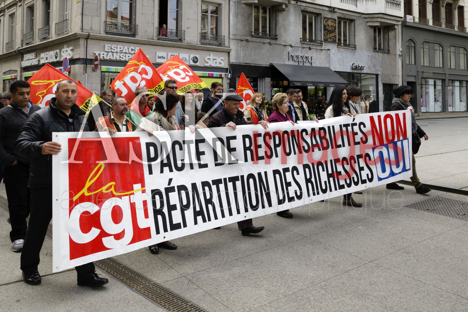 | Description | Defile du 1er mai sur fond de pacte de responsabilite - le 01-05-2014 *** May 1st demonstration, Saint-Etienne, France. |