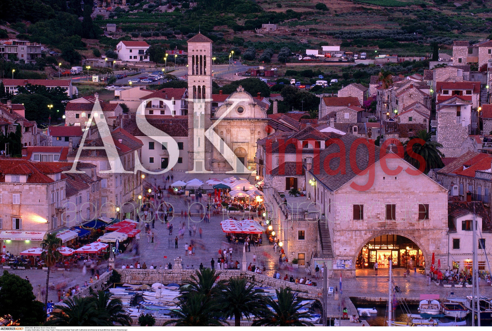 | Description | Croatia / Dalmatia / Hvar / Hvar Town / View across Hvar Town with Cathedral and Arsenal at dusk..© Oliver Bolch / Anzenberger |
