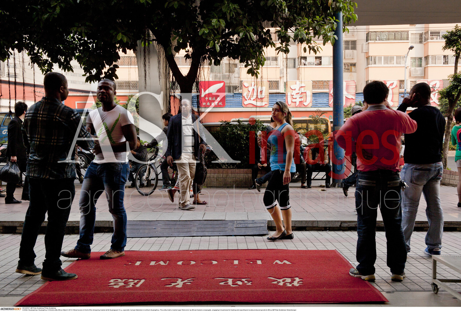DescriptionCHINA / Guangdong / Guangzhou / China's Little Africa / .Street scene in front of the shopping market at 99 Guangyuan Xi Lu, opposite Canaan Markets in northern Guangzhou. The entry mat to market says 'Welcome' as African traders congregate, engaging in business for trading and exporting to locally produced goods to Africa. ..© Philip Gostelow / Anzenberger