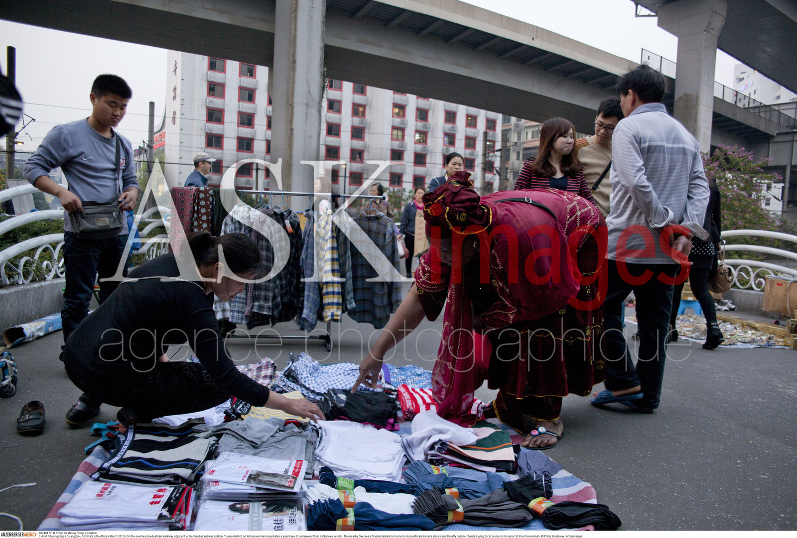 | Description | CHINA / Guangdong / Guangzhou / China's Little Africa / .On the overhead pedestrian walkway adjacent to the Xiaobei subway station, Yuexiu district, an African woman negotiates a purchase of underwear from a Chinese vendor. The nearby Overseas Traders Market is home to many African trader's shops and fly in/fly out merchants buying local products for export to their homelands. ..© Philip Gostelow / Anzenberger |