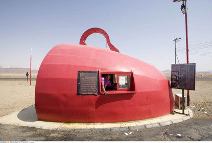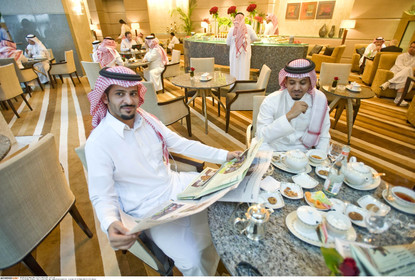 SAUDI ARABIA / Hegra / Mada'in Saleh / sister town of Petra (Jordan), is the symbol of the wealth of the Nabataens civilization (1st Century A.D.) who carved in the sandstone 133 tombs / Nabataens tomb of El Ferid or Mahal el Megless. Bedouin sitting in front of the site
