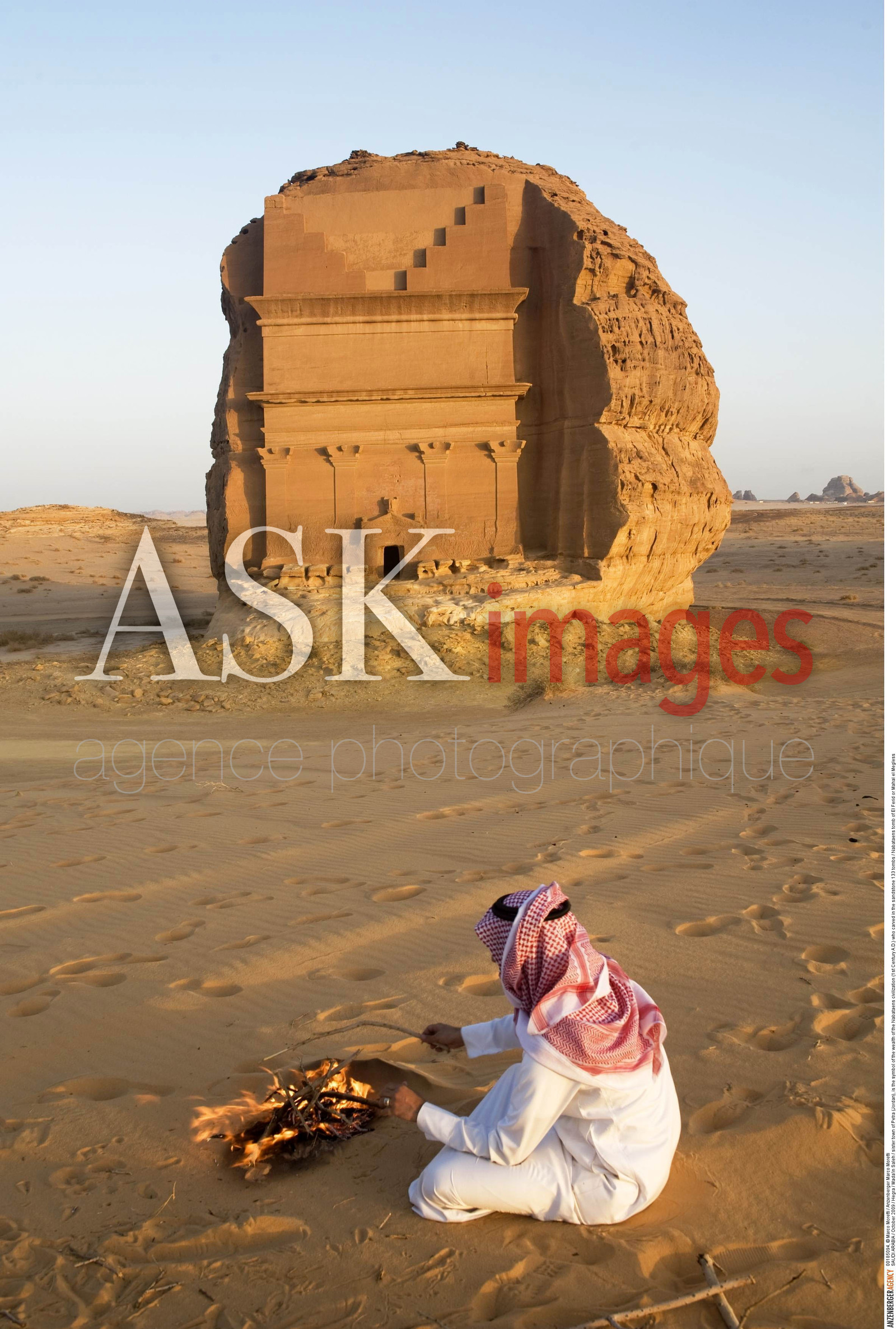 | Description | SAUDI ARABIA / Hegra / Mada'in Saleh / sister town of Petra (Jordan), is the symbol of the wealth of the Nabataens civilization (1st Century A.D.) who carved in the sandstone 133 tombs / Nabataens tomb of El Ferid or Mahal el Megless. Bedouin sitting in front of the site |