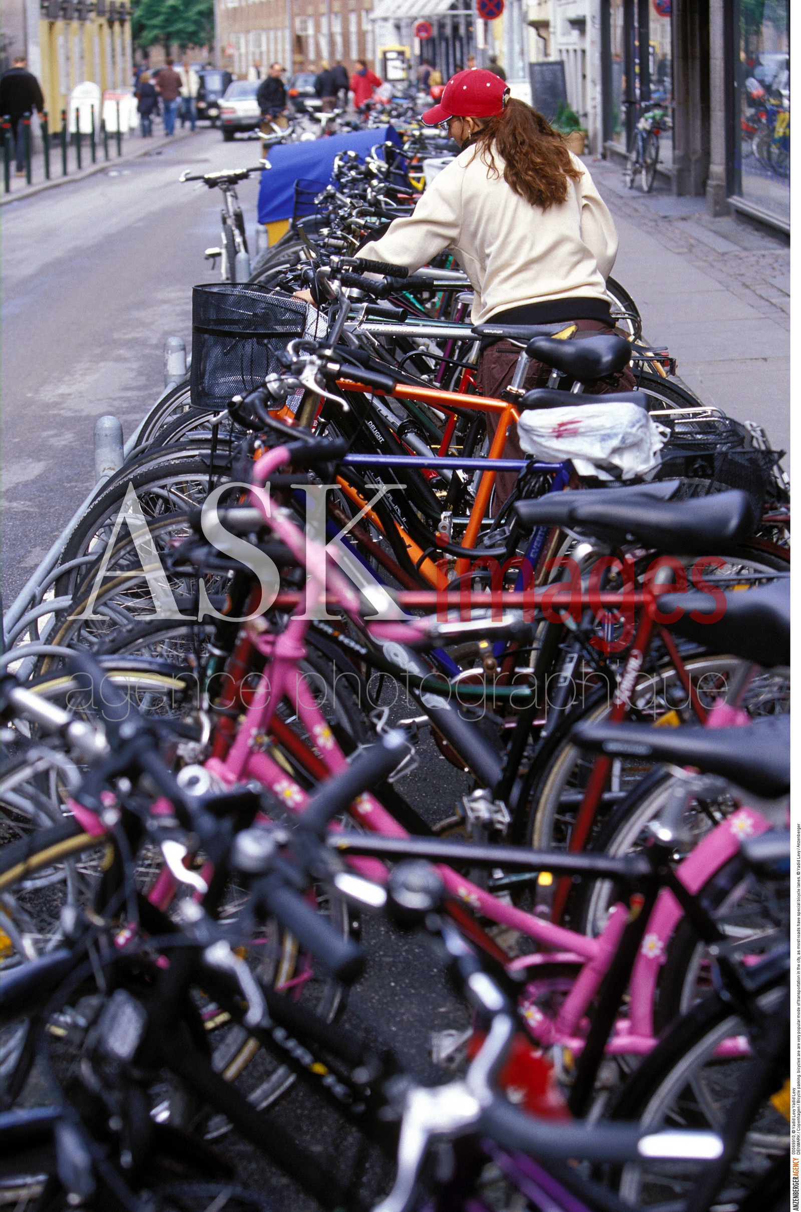 DescriptionDENMARK / Copenhagen / Bicycle parking. bicycles are are very popular mode of transportation in the city, as most roads have special bicycle lanes.