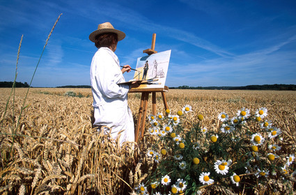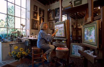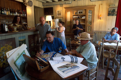 Painters at work, the Ermitage Saint Antoine wine bar, Barbizon, Ile de France.. France, painters of Barbizon