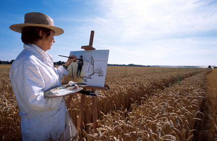 Barbizon, Fontainebleau forest, The painters' path, Female painter sketching with charcoal, Ile de France. France, painters of Barbizon