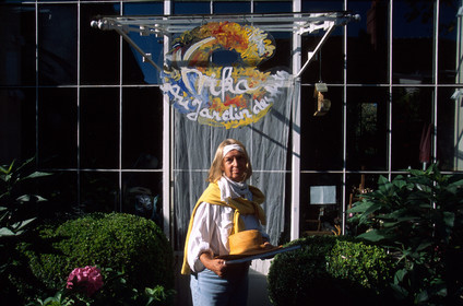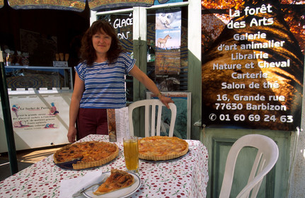 Barbizon, Catherine offering tea, apricot tarts and other pastries at Foret des Arts, Ile de France.. France, painters of Barbizon