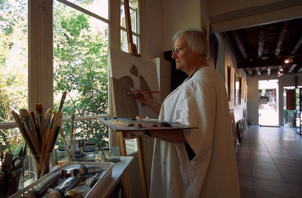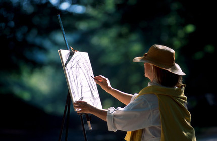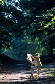 Barbizon, Fontainebleau forest, The painters' path, Female painter sketching with charcoal. France, painters of Barbizon