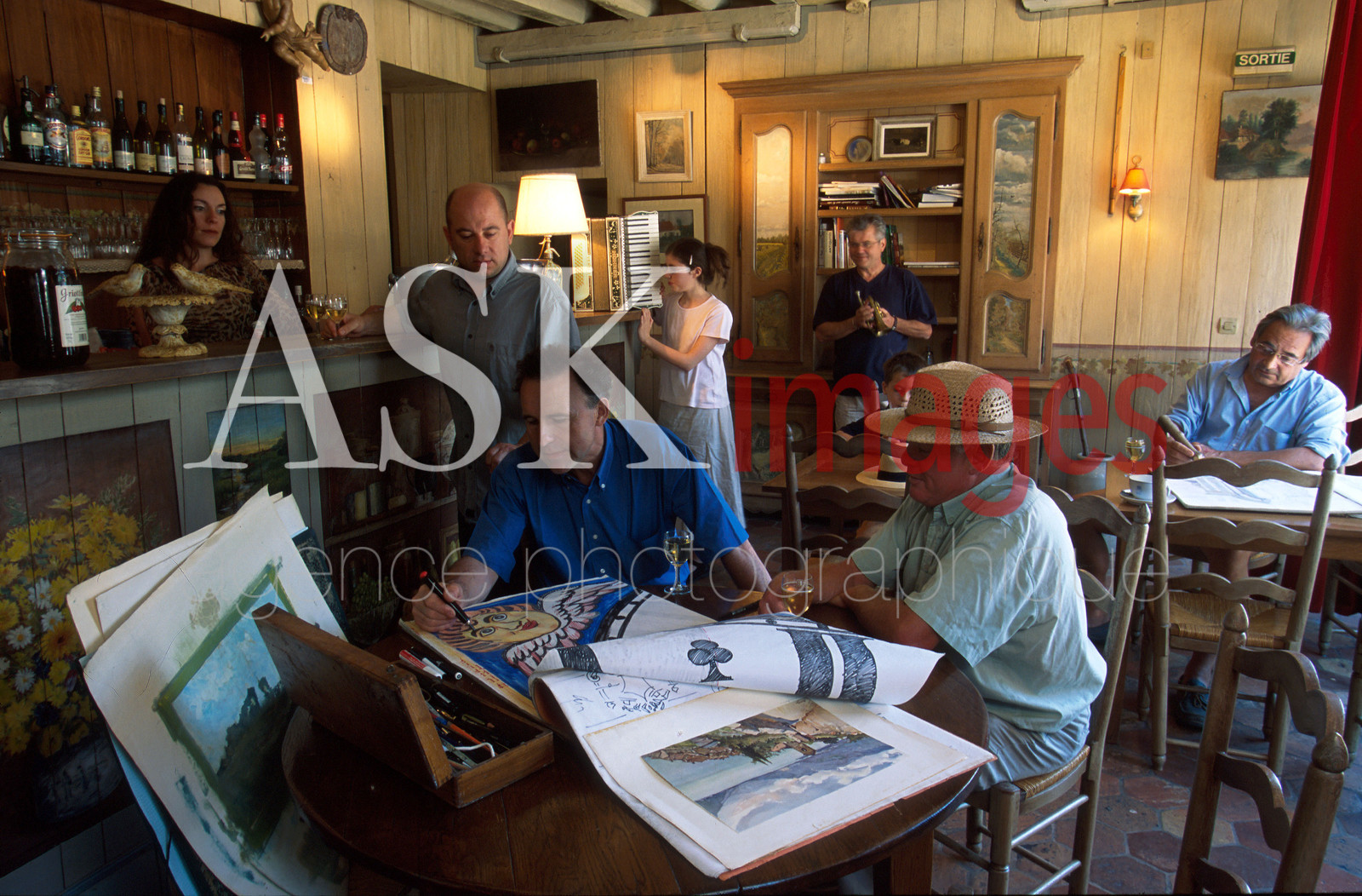| Description | Painters at work, the Ermitage Saint Antoine wine bar, Barbizon, Ile de France.. |