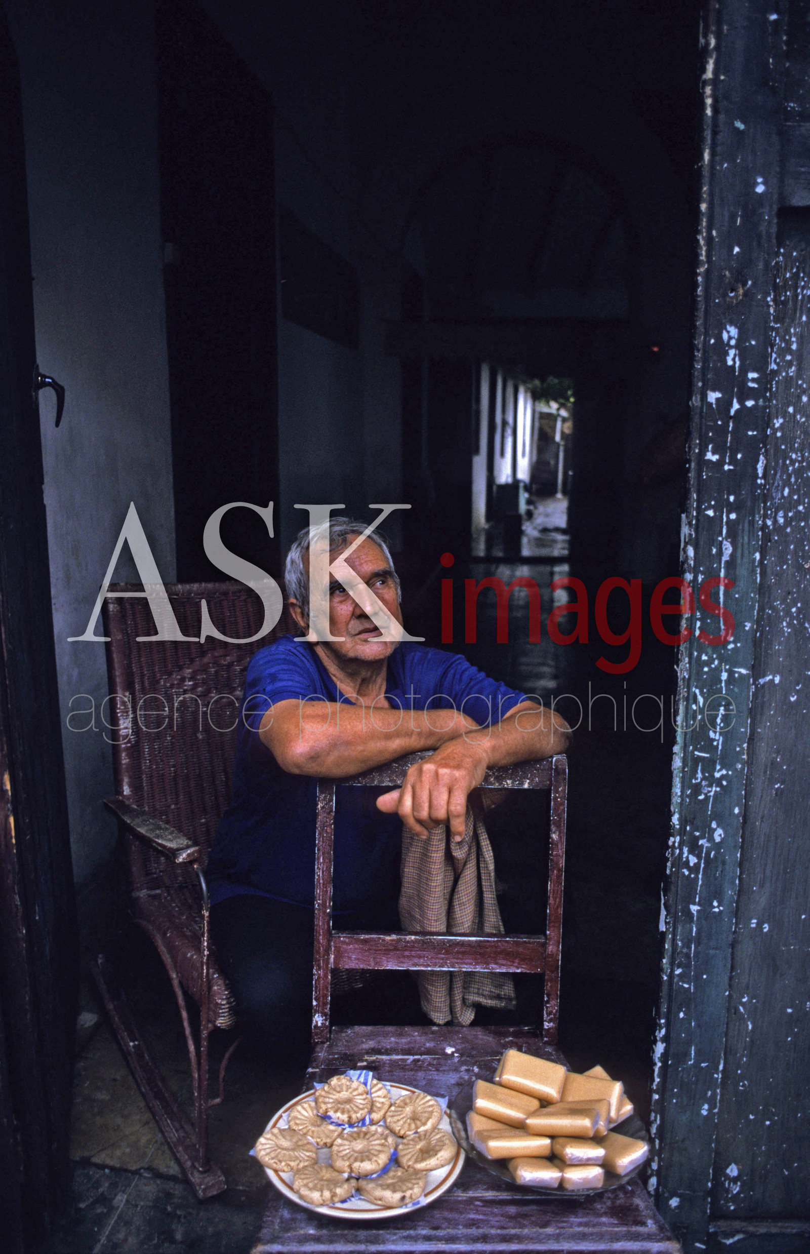 An inhabitant of Camarguey selling some cakes, Cuba.