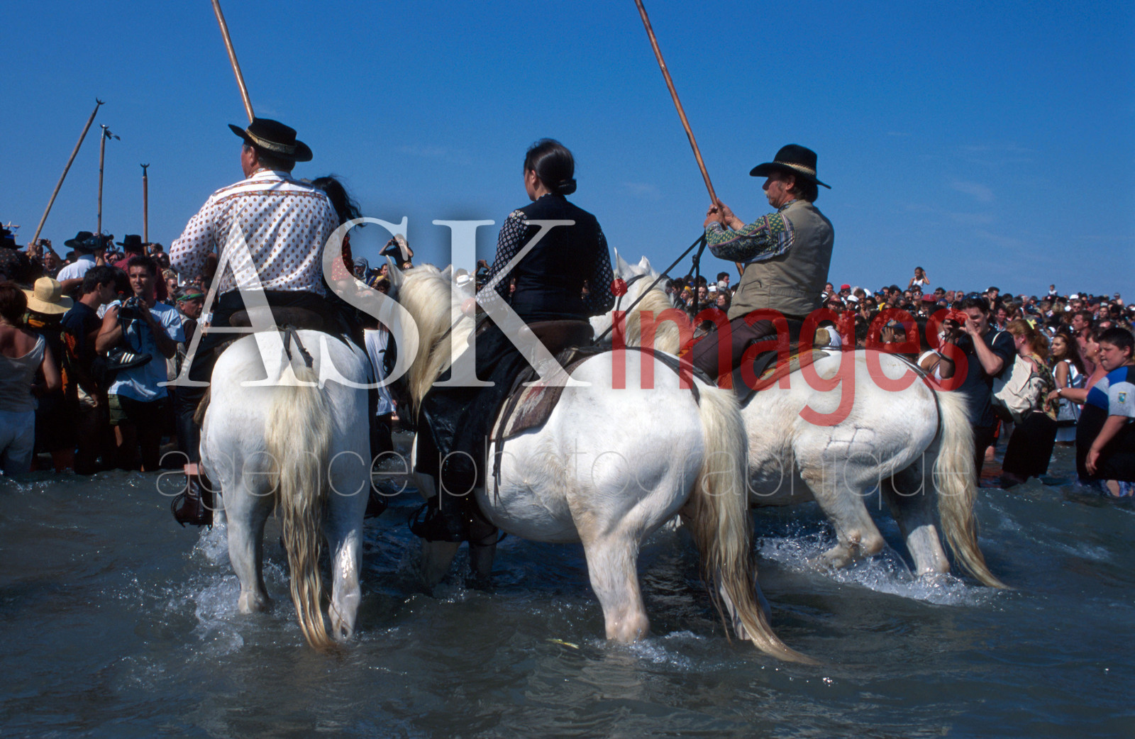 | Description | France, Camargue, Les Saintes Maries de la Mer, Gipsy festival, gardians (the cowherds) with tourists.. |