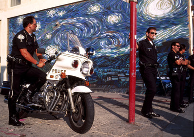 California, Los Angeles, Venice beach, guitar player on roller skates playing guitar.. California, Los Angeles
