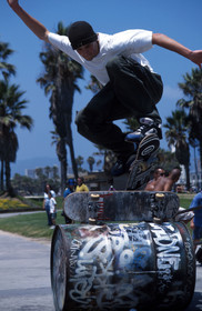California, Los Angeles, Venice Beach, man jumping over a barrel with skate.. California, Los Angeles