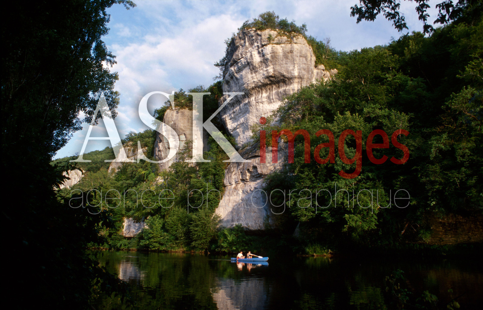 | Description | Cliff of Tours, La Vezere river, Canoe on river, Dordogne |