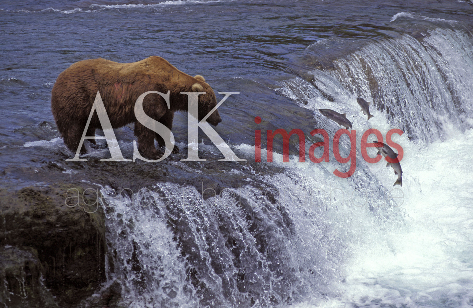 DescriptionCascade de Brooks river. Un ours se tient en haut de la cascade et attend qu'un saumon saute pres de lui pour l'attraper.