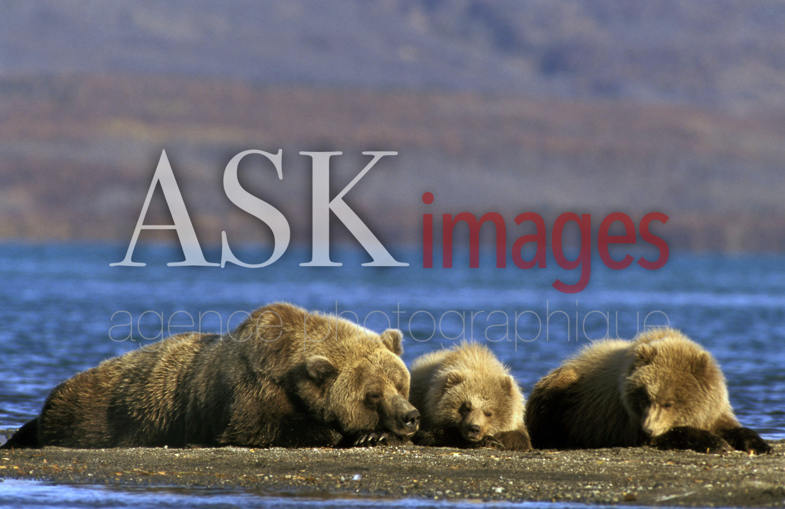 | Description | Brooks river, les oursons et leur mere se reposent au bord de la riviere. |