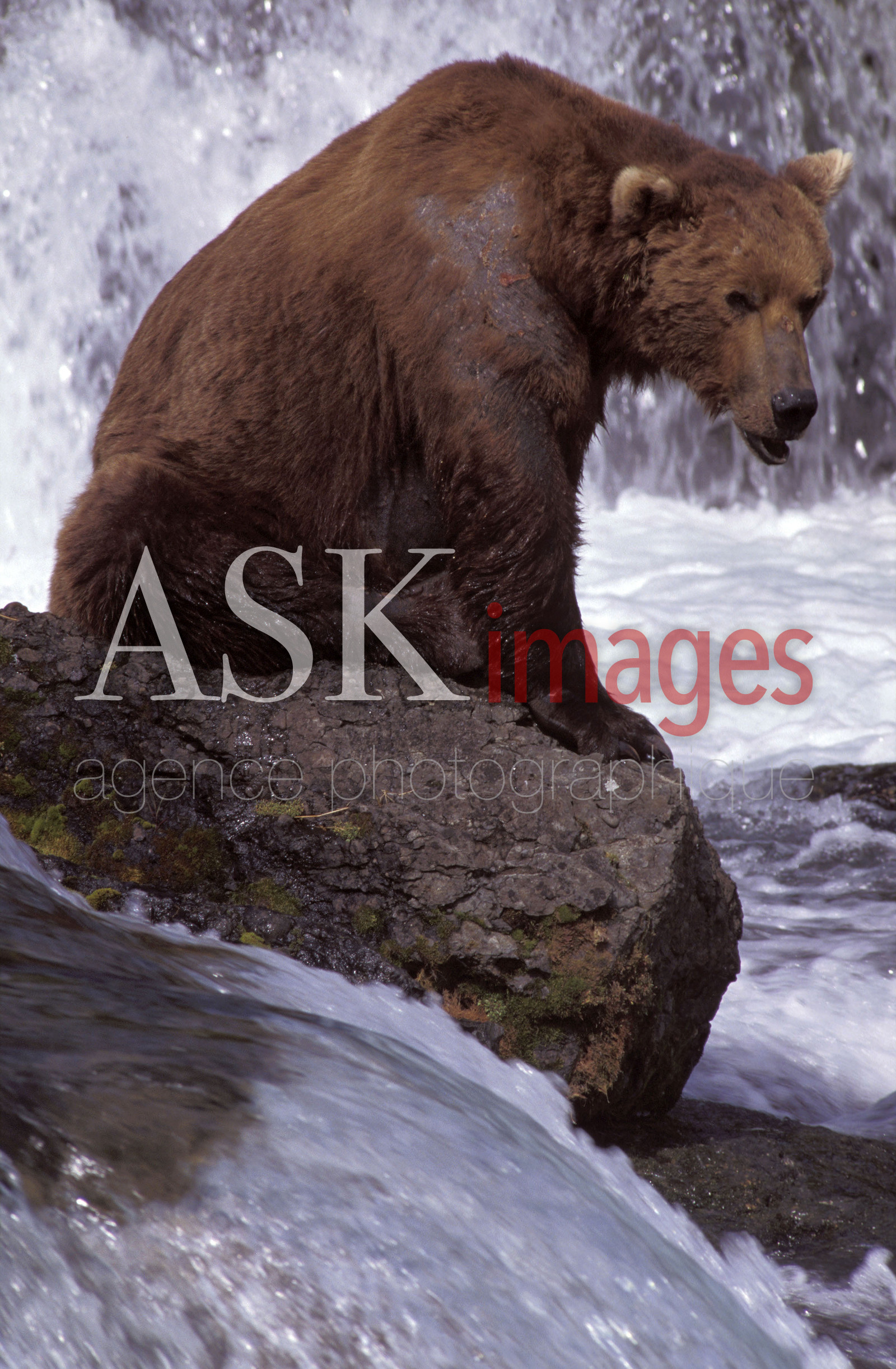 | Description | Cascade de Brooks river. Un ours se tient en haut de la cascade et attend qu'un saumon saute pres de lui pour l'attraper. |