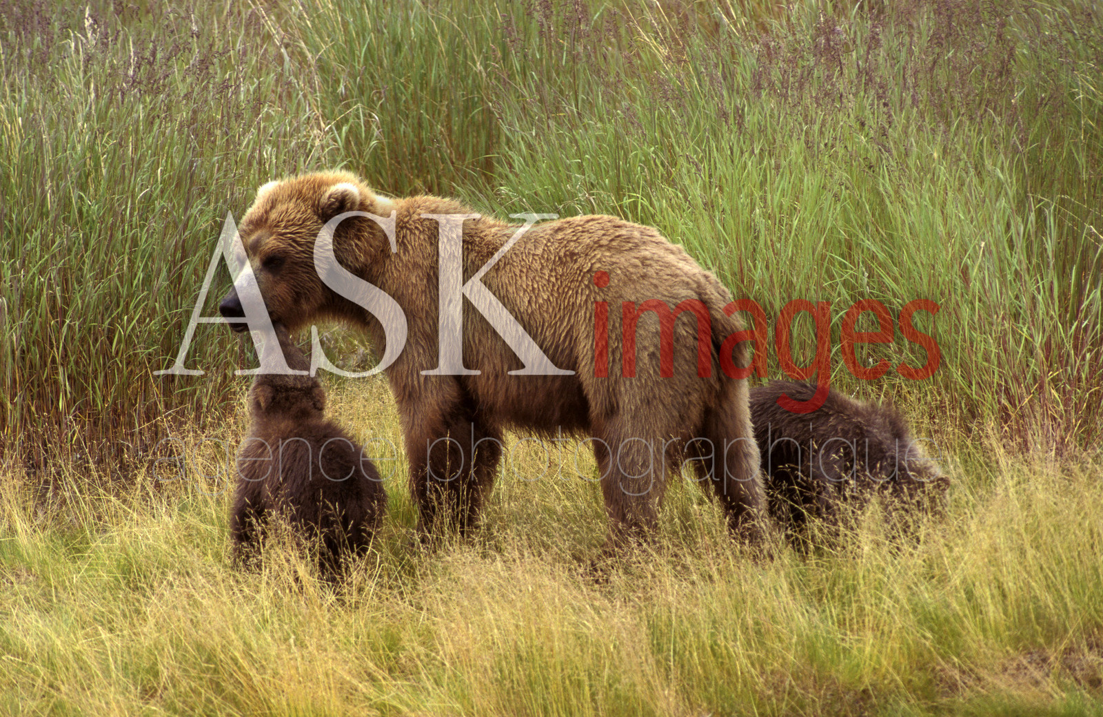| Description | McNeil river state, les oursons jouent avec leur mere au bord de la riviere. |