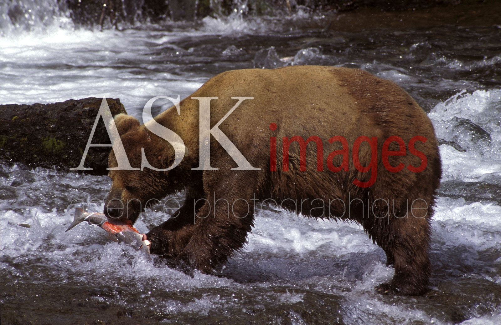 DescriptionBrooks river. Une femelle attrape un saumon.