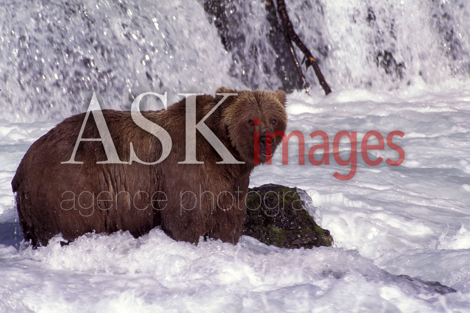 | Description | Cascade de Brooks river. Un ours se tient en haut de la cascade et attend qu'un saumon saute pres de lui pour l'attraper. |